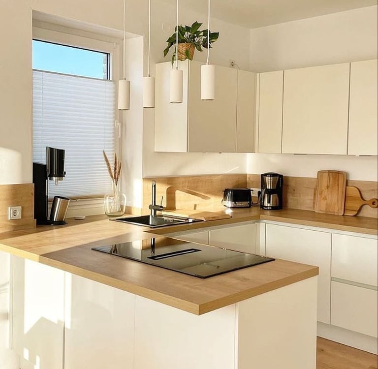 La cocina con península es similar a la isla, pero con una diferencia clave: está conectada a una pared o a otro módulo de la cocina.