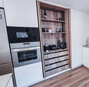El mueble desayunador escamoteable es la solución definitiva al desorden visible. Sus puertas se deslizan y desaparecen lateralmente, permitiendo que un espacio de 100 cm de ancho se convierta en tu estación de café o tostadas, y que, con un simple gesto, vuelva a la calma visual.