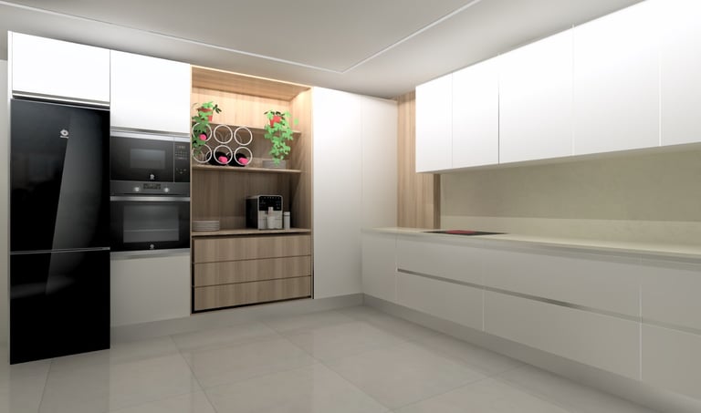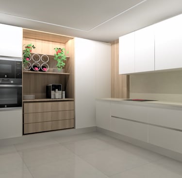 Este contraste entre el blanco brillante y la madera natural genera un ambiente moderno, acogedor y fácil de mantener.