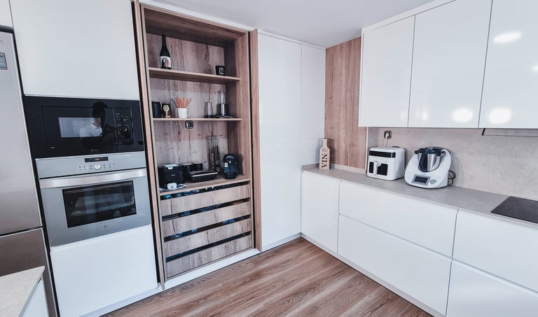 Este proyecto nació con una idea tan clara que sabíamos desde el primer momento que iba a ser diferente. Esta cocina en Granada es justo eso: el equilibrio perfecto entre diseño de vanguardia y vida real. Olvídate de cocinas que solo sirven para mirar. Este es un espacio abierto, luminoso y pensado para adaptarse a tu ritmo, no al revés, gracias a la joya de la corona: su isla móvil y el desayunador escamoteable.